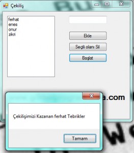 Çekilişten Kişi SilmeÇekilişi Başlatusing System; using System.Collections.Generic; using System.ComponentModel; using System.Data; using System.Drawing; using System.Linq; using System.Text; using System.Threading.Tasks; using System.Windows.Forms; using System.Collections;//ArrayList(Sınırsız Dizi)Kullanıcağımız için ekledim namespace Ferhat { public partial class Form1 : Form { public Form1() { InitializeComponent(); } ArrayList cekilis = new ArrayList(); private void btnEkle_Click(object sender, EventArgs e) { cekilis.Add(textBox1.Text); listBox1.Items.Clear(); foreach (string cek in cekilis) { listBox1.Items.Add(cek); } textBox1.Clear(); } private void btnSil_Click(object sender, EventArgs e) { cekilis.Remove(listBox1.Text); listBox1.Items.Clear(); foreach (string del in cekilis) { listBox1.Items.Add(del); } MessageBox.Show("Kişi Silindi", "☺", MessageBoxButtons.OK, MessageBoxIcon.Information); } private void btnBaşlat_Click(object sender, EventArgs e) { Random sayi = new Random(); int kura = sayi.Next(cekilis.Count); MessageBox.Show("Çekilişimizi Kazanan " + cekilis[kura] + " Tebrikler"); } } }